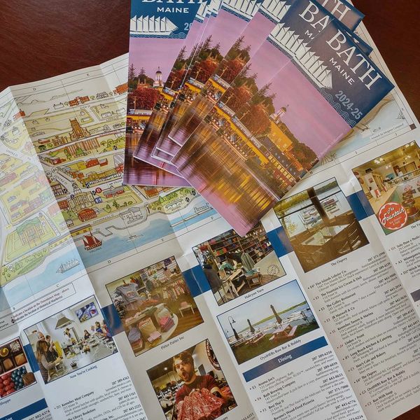 The Map of Bath is produced annually but Main Street Bath. We work with a local printer who finishes 25,000 copies each year for distribution. We have to admit, it's a beautiful design, which varies each year with stunning photos of the area and intriguing language to entice folks to stay. It offers businesses a chance to get in front of thousands of visitors, tourists and incoming residents. Placed in hotel rooms, restaurants, businesses and information centers throughout Maine, it's an easy way to say Hello!